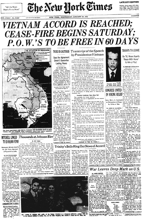 In depicting the progress of events leading to the Paris Agreement, Pierre Asselin seeks to shed light on the circumstances that lead to its failure. He includes military campaigns, but focuses on diplomatic actions of ambassadors. Thus, Asselin believes that although military action was influential, the negotiations between both sides for concessions marks the true struggle the U.S. faced towards the end of the war. The goal was no longer military victory but peace with honor which Kissinger emphasized: “It is essential that we leave Vietnam as an act of governmental policy and with dignity, not as a response to pressures and in the form of collapse.”21 Thus, Kissinger sought an “agreement that softened the blow of defeat and thereby avoided the most obvious consequences of capitulation to American credibility.”22 The result was the Paris Peace Accords. Therefore, the accords were created for the sole purpose of extricating the U.S. from the Vietnam War, but failed to create any permanent changes and ultimately failed in its role.