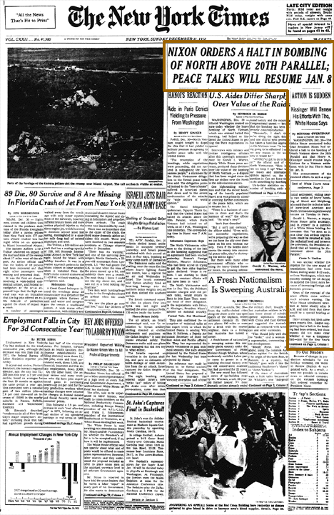In its attempt to end the war quickly, the DRVN made several concessions, but the agreement still required several hours of bargaining. On October 11, an agreement requiring the signatures of the DRVN, NLF, GVN, and U.S. was drawn. The treaty included a cease-fire, U.S. withdrawal from Vietnam, termination of foreign aid, return of POWs, and gave self-determination to the South Vietnamese. The treaty did not officially include reference to DRVN forces in the South and “excluded those forces from the jurisdiction of the agreement.”12 In other words, North Vietnamese soldiers were allowed to remain in South Vietnam even after the United States left. Upon reading the treaty, Nguyen Theiu, president of the GVN, was “incensed at the concessions Kissinger had made to satisfy the DRVN at the expense of the GVN.”13 He refused to sign the treaty, forcing the war to continue and creating a schism between the Washington and Saigon, the capital of the GVN. In an attempt to persuade Thieu, operations Enhance and Enhance Plus sought to “‘enhance’ the fighting capabilities of the GVN and its military forces” before the cease-fire was signed, giving Saigon a better chance to defeat Hanoi. Despite offers to make changes, Kissinger failed to convince Thieu to sign the agreement: “he would not accept the present agreement or any other agreement, and his decision was final.”14 Despite the growing gap between Washington and Saigon, the U.S. did not sign a separate treaty with the DRVN and continued to send aid to the South. The continuation of the war led the DRVN to turn back to military force and convinced Nixon that “[they] must have a settlement or Congress would end aid to Saigon and let the war run its course without further American involvement.”15 Through the threat of potential Congressional interference, Nixon attempted to pressure Thieu to reconsider an agreement, but failed to change his mind.