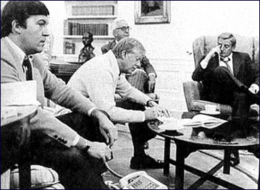 Houghton continues by providing a few alternate reasons to explain Carter’s actions. It is clear that Carter faced pressure from public media, such as CBS’s Walter Cronkite and ABC’s Ted Koppel, and he may have been feeling political pressure from his administrative staff as well. After his approval rate jumped to 61 percent, it dropped down to around 40 percent by April 1980 because of public dissatisfaction regarding the lack of American action. “If Carter had taken a very extreme, firm position, a declaration of war, an immediate naval blockade or some such thing, that could have won him the presidential election in 1980,” since the public wished to see tangible proof that the U.S. was trying to retaliate during the hostage crisis.11 This attitude to remain in office may have lead to what Houghton calls “groupthink”, a tendency, which occurs in some groups, to reach premature consensus without having fully thought through the complete range of available options or their implications. With the public wanting to see action and with military rescue being a plausible option, Carter may have chosen to compromise his personal ideals in order to solve the conflict at hand and attempt to secure his position in the future. Groupthink would also explain why Vance was one of the few proponents of stalling the hostage crisis because his position would not be affected by the next election.